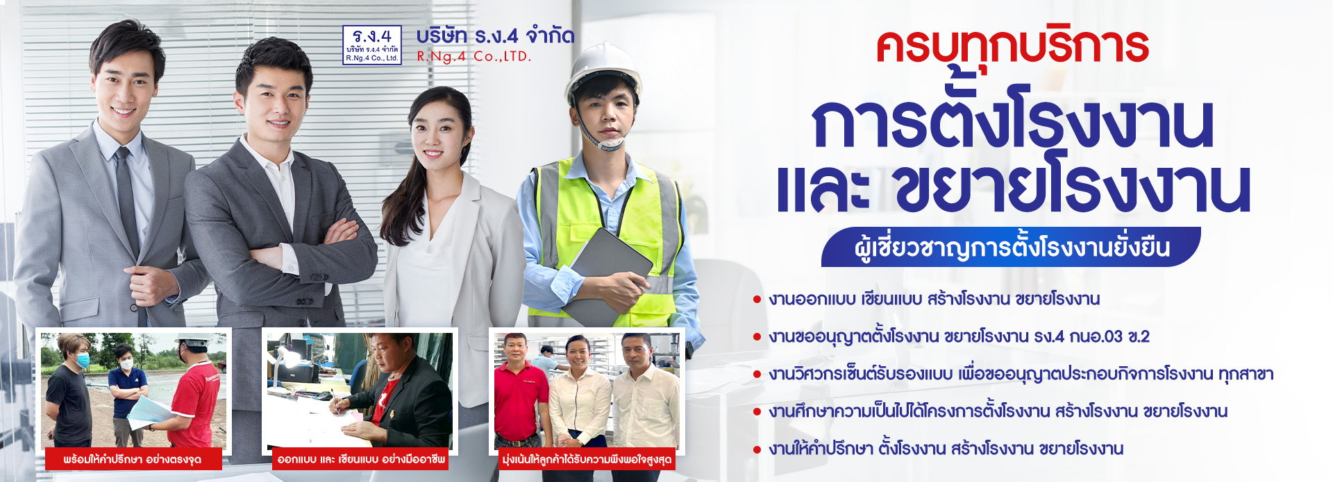 เราจึงก่อตั้ง บริษัท ร.ง.4 จำกัด เพื่อ รับสร้างโรงงาน ขยายโรงงานและระบบผลิต ในความรับผิดชอบ ของวิศวกรต้องปฏิบัติตาม จรรยาบรรณวิชาชีพวิศวกร ทำงานตามกฎหมาย ข้อบังคับ ประกาศ และ มาตรฐานต่างๆ ที่เกี่ยวข้องในงานวิศวกรรมโรงงาน ให้บริการ แบบครบวงจร ปฎิบัติงาน และ ตรวจรับรองโดย ทีม สามัญวิศวกร และวุฒิวิศวกร ทุกสาขา